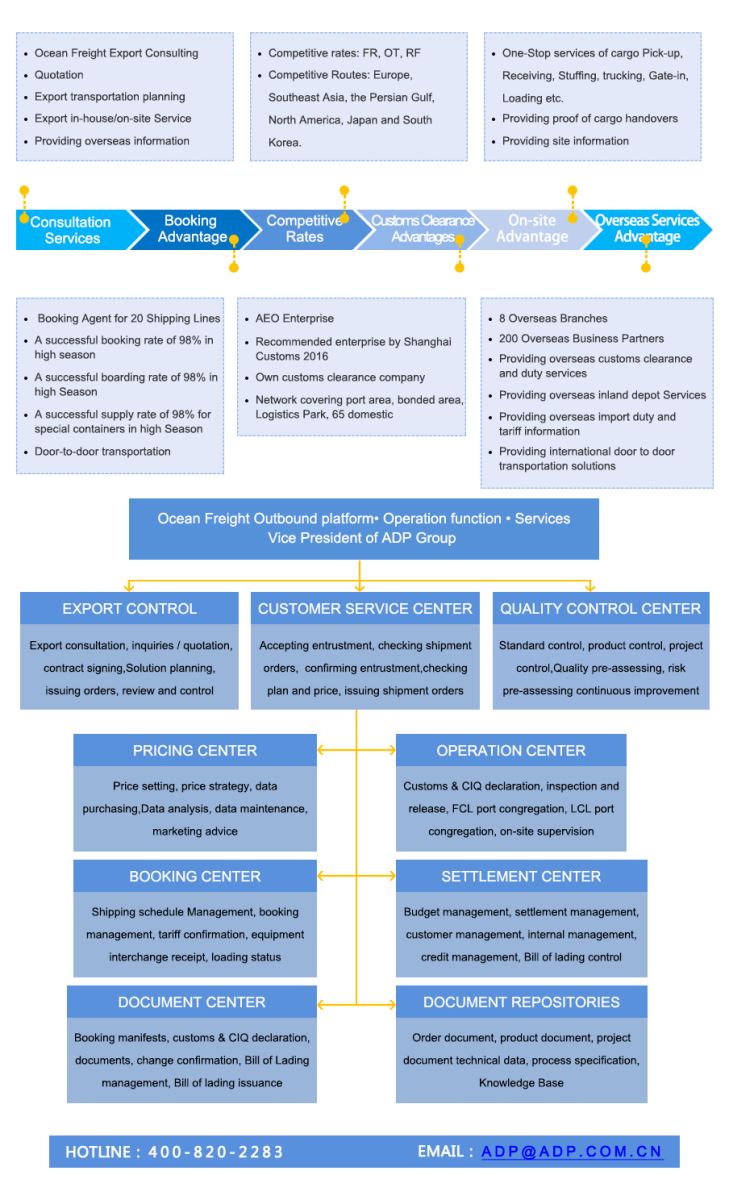 The Ocean Freight Outbound Platform is a platform where ADP provides international ocean freight export booking, transport, management and services to domestic and foreign customers.