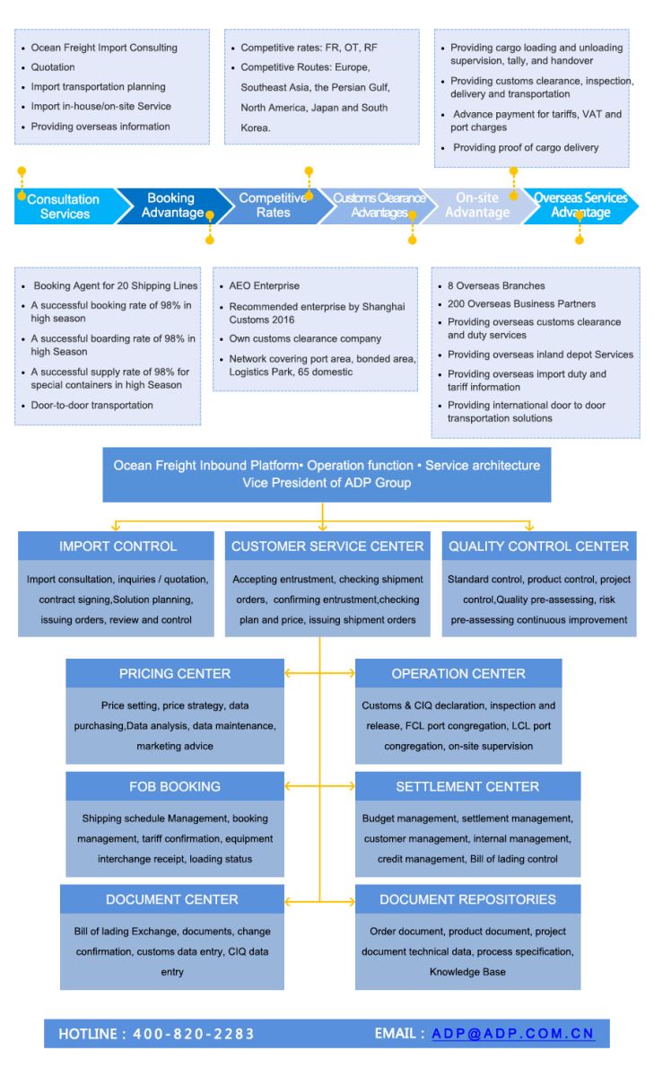 Ocean Freight Inbound Platform is a platform where ADP provides import transport, import Customs Inspection Declaration, import control and service to domestic and foreign customers.