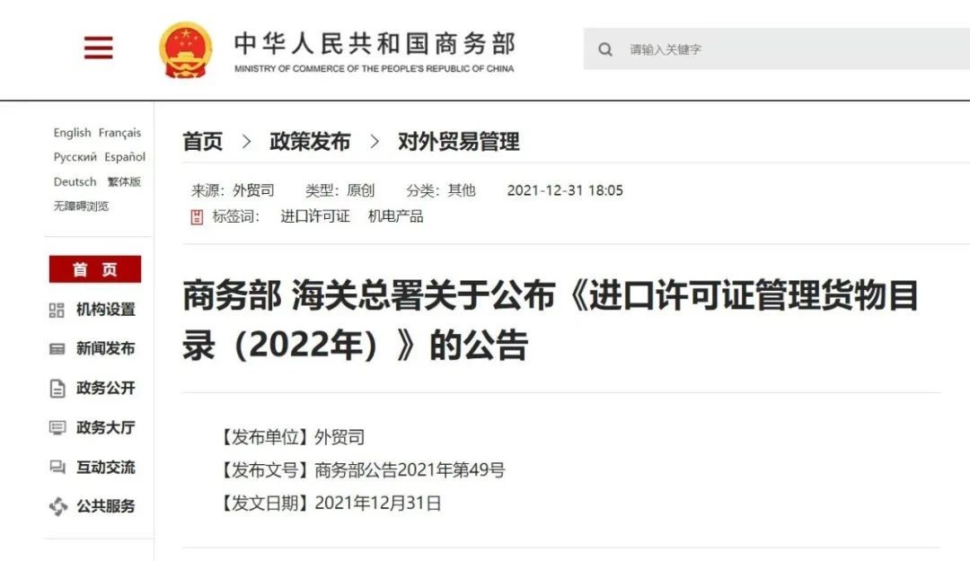 (2) According to the Joint Announcement (2021) No. 49 of the General Administration of Customs and the Ministry of Commerce, the commodities subject to import license management in 2022 include ozone-depleting products and key used mechanical and electrical products.
