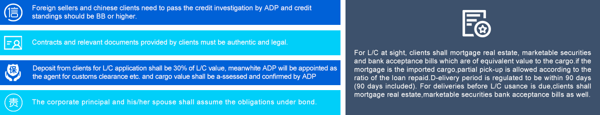 Integrated and comprehensive trading services including customs clearance,logis-tics and financing,financing will be granted after ADP's examination,acquisition of cargo ownership and real estate mortgage.