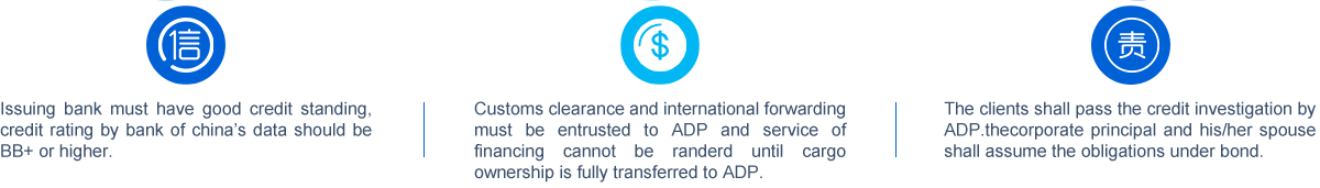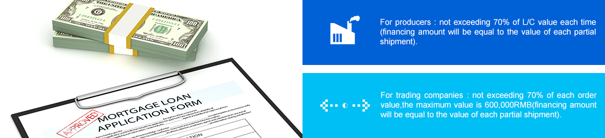 Comprehensive services including export agency and financing services,which enables the customer to obtain loans amounting to 70% of the cargo value (or L/C value) on condition of the examina-tion and acceptance of L/C and full transfer of the cargo ownership to ADP.