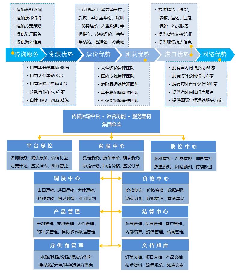 内陆运输平台专注综合口岸物流、集装箱、件杂货、特种货及大型设备的内陆运输;提供往返于港口、城市、工厂或门点的干线和支线运输服务;承接国际多式联运在中国境内的门到门运输;承接自贸区物流、配送物流、会展物流、冷链物流、私人物品、食品、化妆品、汽车与汽车零部件、电子元器件、家具家居的运输供应链管理服务。