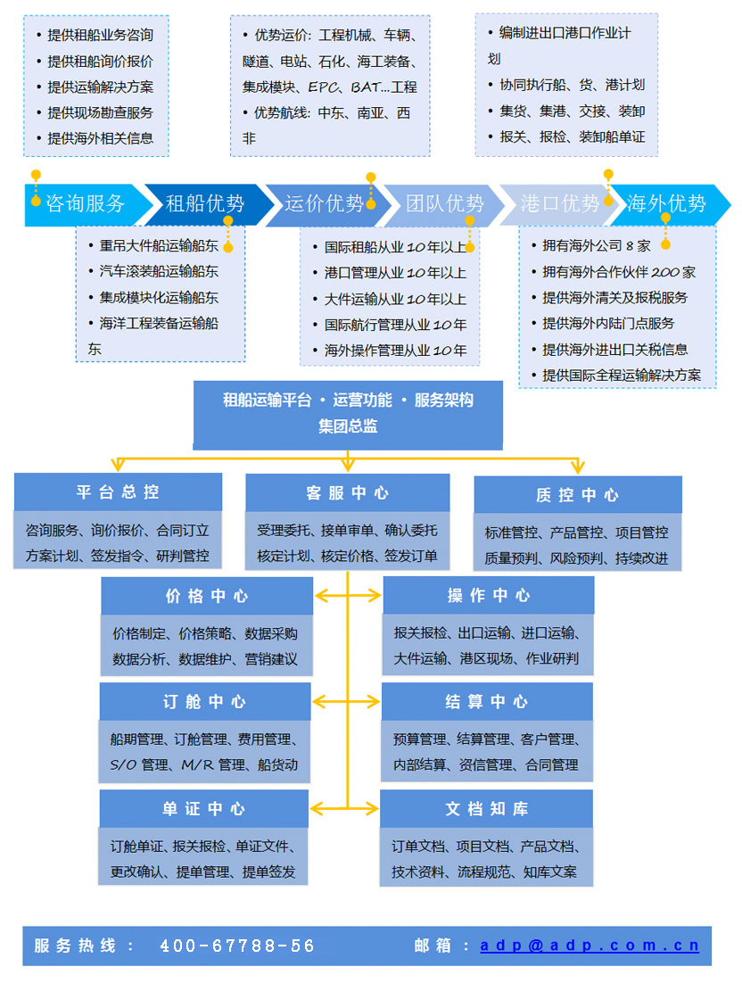 租船运输平台专注件杂货、工程项目、大型设备、特种设备的航次租船、多航次租船、包运租船、特种船租船;提供询盘、发盘、还盘、受盘、签约及租船运输的运营与服务保障;承接中国至海外的EPC, BOT... 工程项目物流的海外门到门运输及国际多式联运服务。