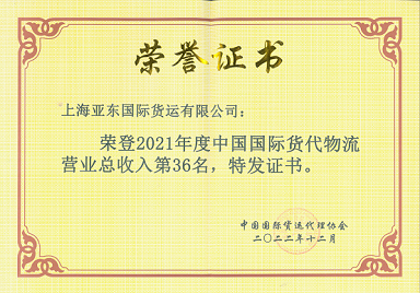 2021年度中国国际货代物流百强排名第36名
