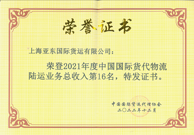 2021年度中国国际货代物流百强排名陆运16名