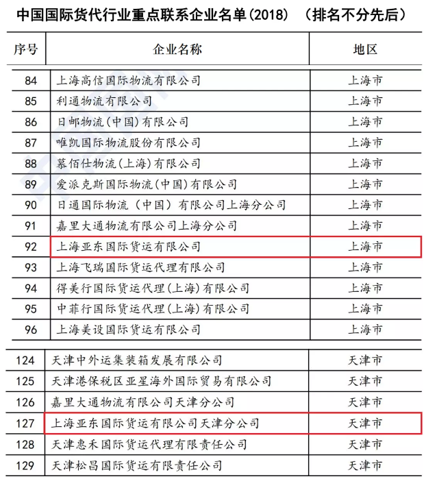 经过地方及国家商务主管部门的层层审核,综合考虑业务形态、管理技术、资源设施、区域分布、企业类型等因素,上海亚东国际货运有限公司与上海亚东国际货运有限公司天津分公司脱颖而出,共同成功入选2018年度中国国际货代行业重点联系企业。
