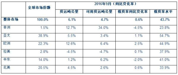 中东航空公司2016年9月份货运需求增长缓慢,连续三个月仅同比增长了1.2%——是自2009年7月份以来的最低速率。运力增长6.2%。经历季节调整后的货运需求一直呈上升趋势,在过去一年中的强劲上涨趋势现已停止。该地区业绩下滑部分原因是受到中东至亚洲、中东至北美市场的低迷表现的影响。