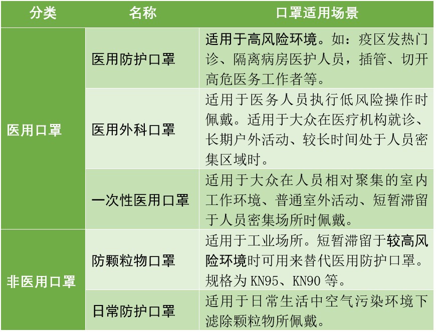 口罩从用途可以分为医用/非医用两大类。顾名思义,医用口罩主要用于医疗方面的防护,可以细分为医用防护、医用外科、一次性医用三种;非医用口罩也被称为个人防护口罩,可根据其适用场景,可细分为防颗粒物和日常防护两种。不同用途的口罩其技术要求不同、适用范围也不同。