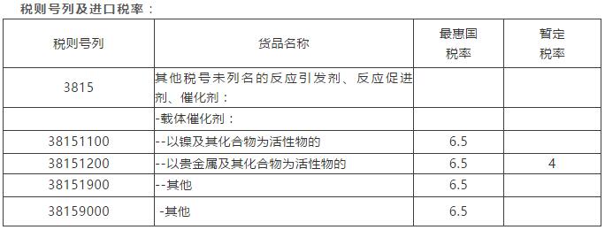 根据《中华人民共和国进出口税则(2020年)》和《进出口税则商品及品目注释(2017年)》,品目38.15项下的催化剂包括引起或促进某些化学反应的制剂,阻止化学反应的产品不归入该品目。主要分成下列两类:(一)主要是由一种或数种活性物质沉积于载体上构成(称作“载体催化剂”)或以活性物质为基料的混合物构成。在大多数情况下,这些活性物质是某些金属、金属氧化物、其他金属化合物及其混合物。经常单独使用或以化合物形式使用的金属是钴、镍、钯、铂、钼、铬、铜或锌。载体(有时可被活化)通常是由钒土、碳、硅胶、硅化石粉或陶瓷材料构成。载体催化剂有齐格勒催化剂及齐格勒-纳塔型催化剂等。(二)是以某些化合物为基本成分的混合物,这些化合物的性质及所占比例按不同的催化化学反应而各不相同。这些制剂包括:自由基“催化剂”(例如,有机过氧化物或偶氮化合物的有机溶液、氧化还原混合物);离子“催化剂”(例如,烷基锂催化剂);“缩聚反应催化剂”(例如,乙酸钙与三氧化锑的混合物)。