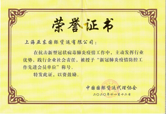 中国国际货运代理协会针对亚东在抗击新冠肺炎疫情工作中,主动发挥行业优势,践行企业社会责任,授予亚东“新冠肺炎疫情防控工作先进会员单位”称号,对亚东做出的贡献给予了很大的认可和肯定。