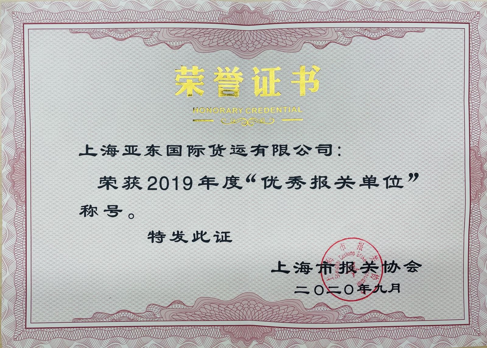 亚东国际物流集团有限公司、上海亚东国际货运有限公司、上海亚东报关有限公司自上海市报关协会开始评选活动至今,已连续多年入选优秀报关企业,这次三家又共同获得“2019年度优秀报关企业”称号,是亚东集团一直秉承“厚德载物,诚信致远”的经营理念,也是亚东人要一直坚持的做事原则。
