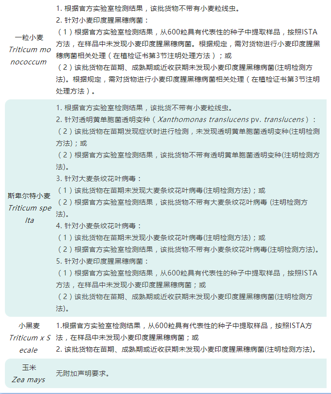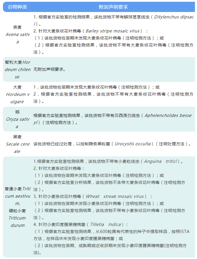 进口以下谷物种子,原产地签发的植物检疫证书应根据不同谷物种类附加声明,具体如下表。