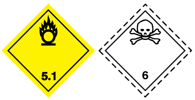 在联合国《关于危险货物运输的建议书 规章范本》(TDG)中,亚硝酸钠被归为第5.1类氧化性物质和6.1类毒性物质,联合国编号为1500,建议包装类别为Ⅲ类。其危险货物运输象形图为: