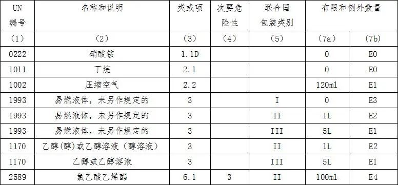 1、该危险货物的UN编号(危险品运输编号)在联合国TDG以及国际海运、空运等危险货物运输法规的《危险货物一览表》第7a列有限数量中所对应的具体数值不是0,则表示该危险货物可以进行有限数量运输。例如下表:
