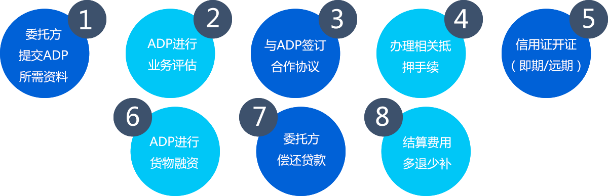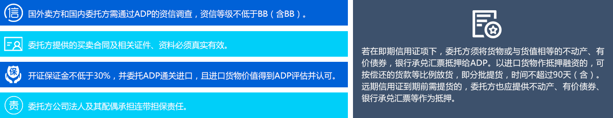 ADP 为信用证交易项下进口买家提供综合贸易服务,在经过 ADP 审核后,可将货权、房产等抵押给